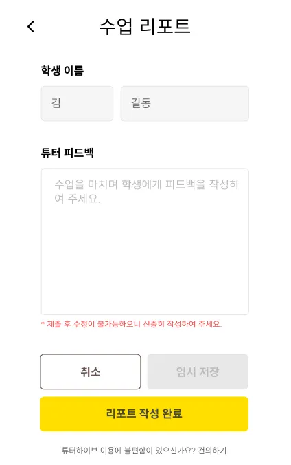 수업이 완료되면, 수업 리포트를 입력해주세요.